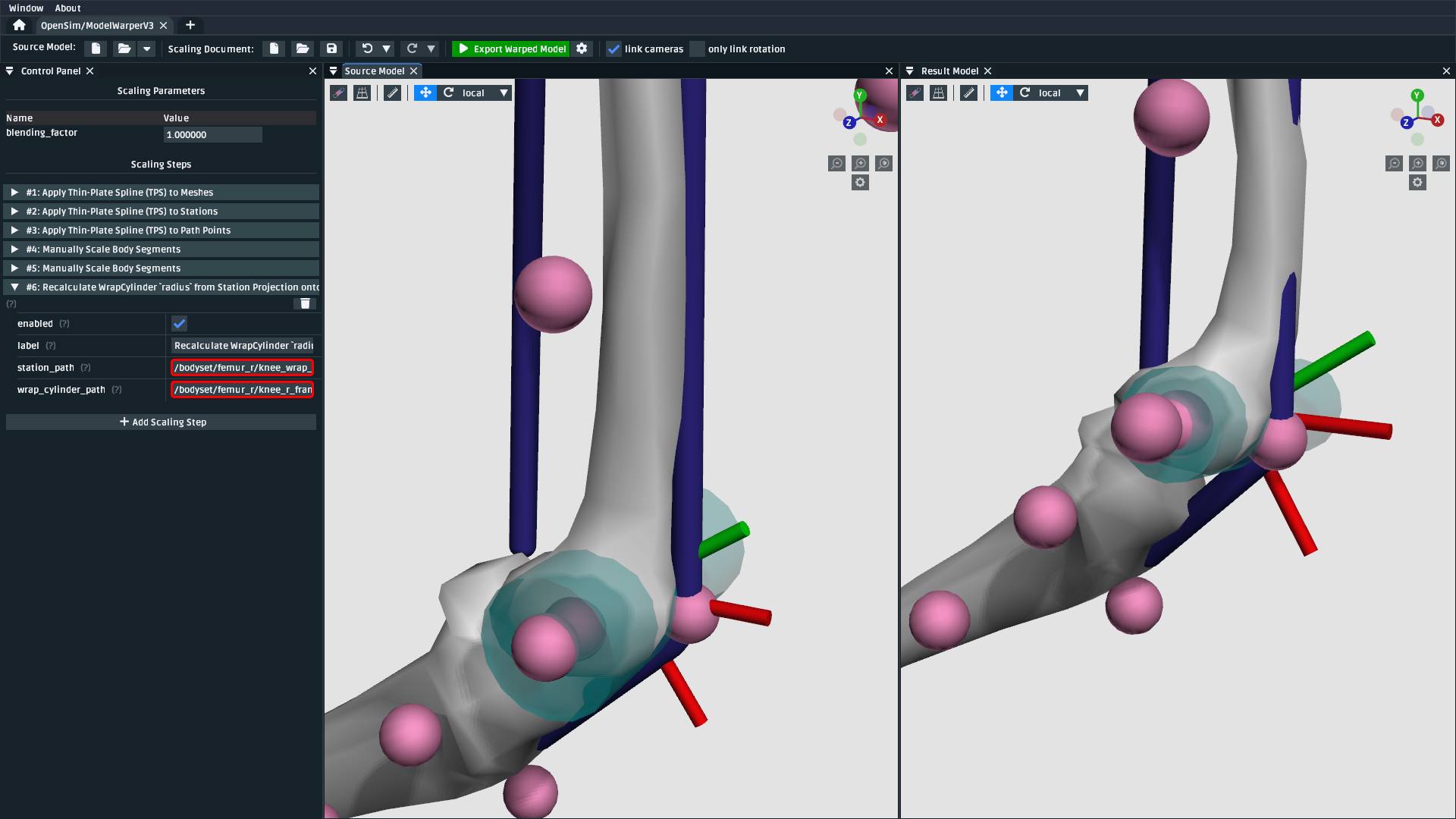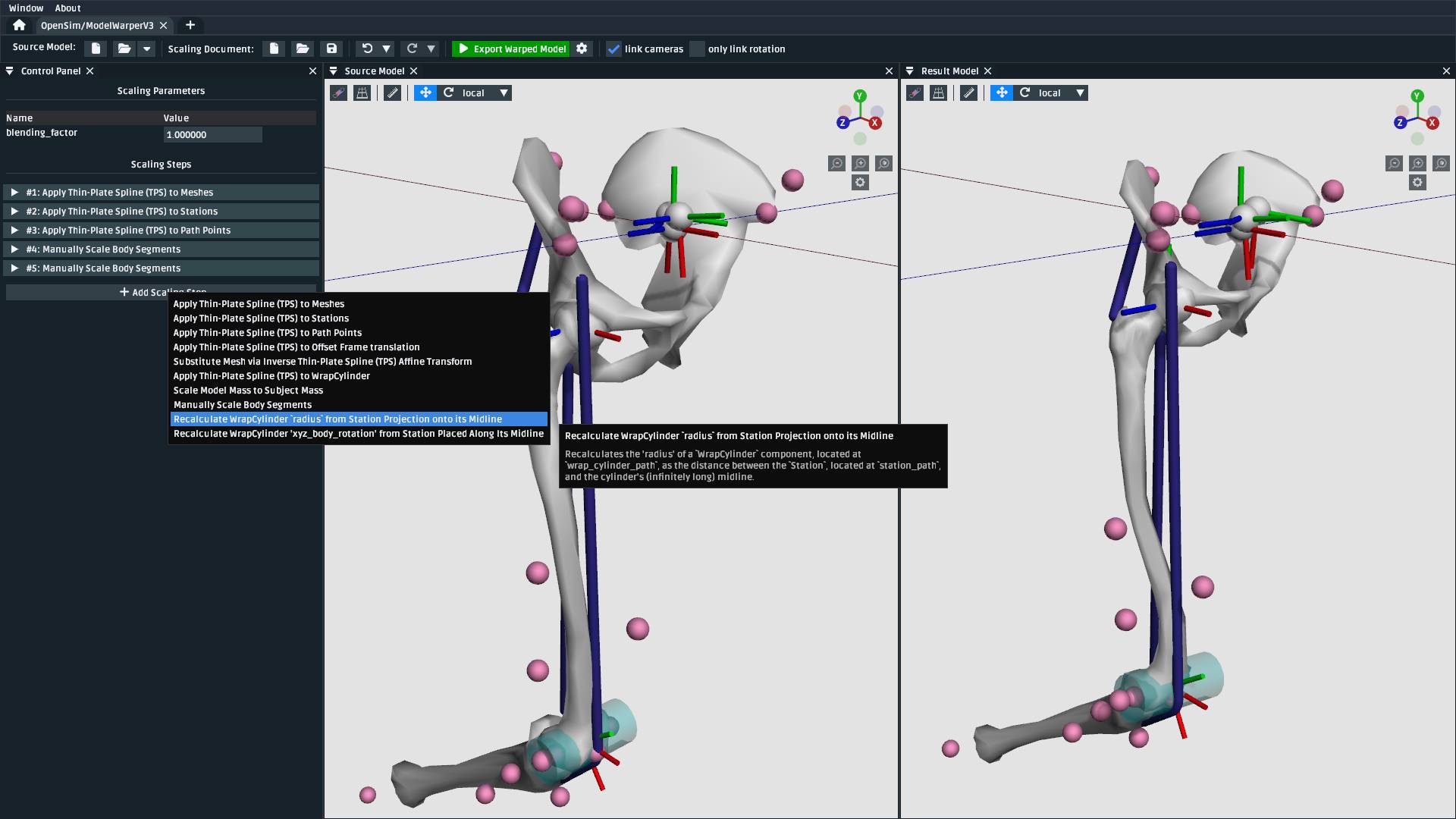 In this tutorial, we built a subject-specific warping pipeline using the model warper in OpenSim Creator. We warped the femur with Thin-Plate Spline (TPS) techniques, adjusted stations and muscle path points to maintain correct anatomical relationships, and manually scaled the pelvis and tibia. By incrementally adding and customizing scaling steps, we created a reusable pipeline that accounted for non-linear changes such as femoral torsion.